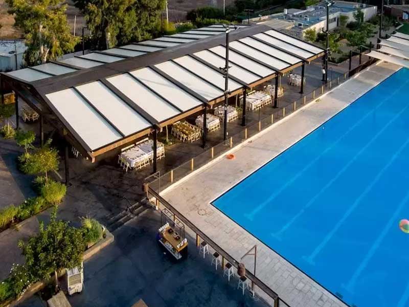הצללה עם 4 עמודי תמיכה ומרזב מים, מתאימה לשטחים פתוחים.