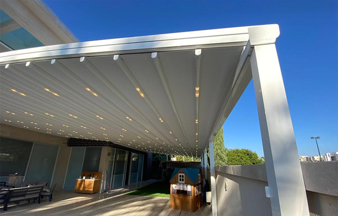 פרגולת אלומיניום חשמלית עם תאורה ומרזב מובנה, מתאימה לבעלי מרפסות